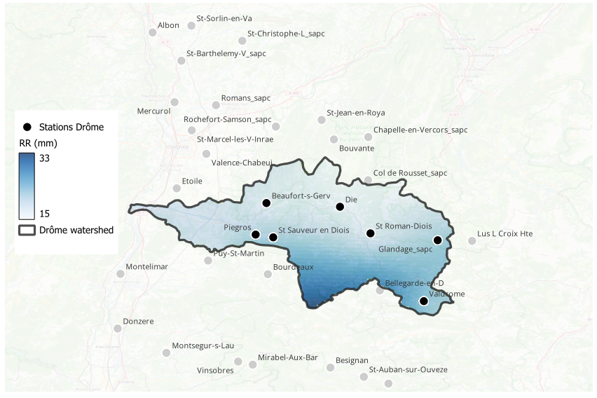 By clipping the interpolation result to the specific shape of the basin, we eliminate irrelevant data outside the study area, focusing the viewer's attention on the hydrological dynamics of the Drôme river.